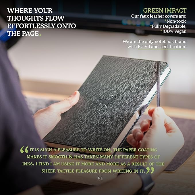 - CRAFTED FOR QUALITY: A hardcover PU vegan leather notebook with micro-perforated cream 100gsm pages. Features an elastic closure, inner pocket, built-in bookmark, and pen holder for organized, convenient, and stylish note-taking anywhere.