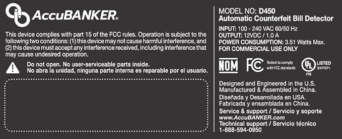 - 5 COUNTERFEIT DETECTION METHODS: AccuBANKER D450 Counterfeit Bill Scanner has Ultraviolet, Magnetic Ink, Infrared, Watermark & Size Detection. NOM Certified & UL Listed