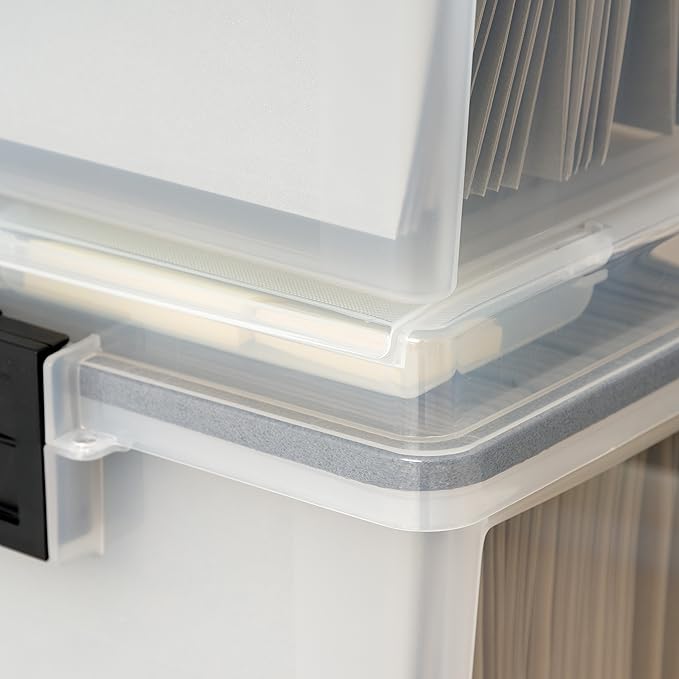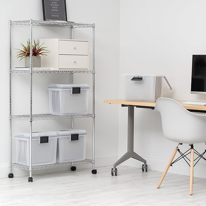 IRIS USA File Box WeatherPro Portable File Organizer Plastic File Box for Letter File w/ Organizer-Lid, Durable Lid and Gasket Seal, Secure Latching Buckles, Stackable, Lockable, Clear 19 Qt. 4 Pack