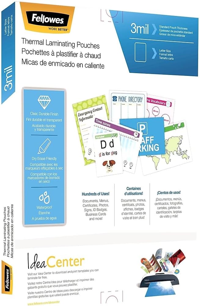 - Give your certificates durable protection with this 100-pack of Fellowes thermal laminating pouches. The waterproof seal safeguards documents from water splashes and wet hands, while the high-quality clear finish boosts visibility and provides a lasting shield. A pack of 100 sheets easily keeps up with your lamination demands. These Fellowes thermal laminating pouches are dry-erase friendly to retain corrections on documents, and the letter-size design is compatible with most thermal laminators.