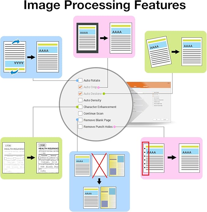 - Intelligent color and image adjustments — Auto Rotate, Crop, Deskew and blank page remove with Plustek Image Processing Technology