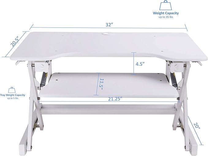 - RETRACTABLE ERGONOMIC KEYBOARD TRAY: 4.5" spacing between keyboard tray and desktop keeps monitor at proper ergonomic height to prevent neck strain while sitting or standing, keyboard tray extends for optimum comfort. Large 21" x 11" keyboard tray size will hold a laptop if needed.