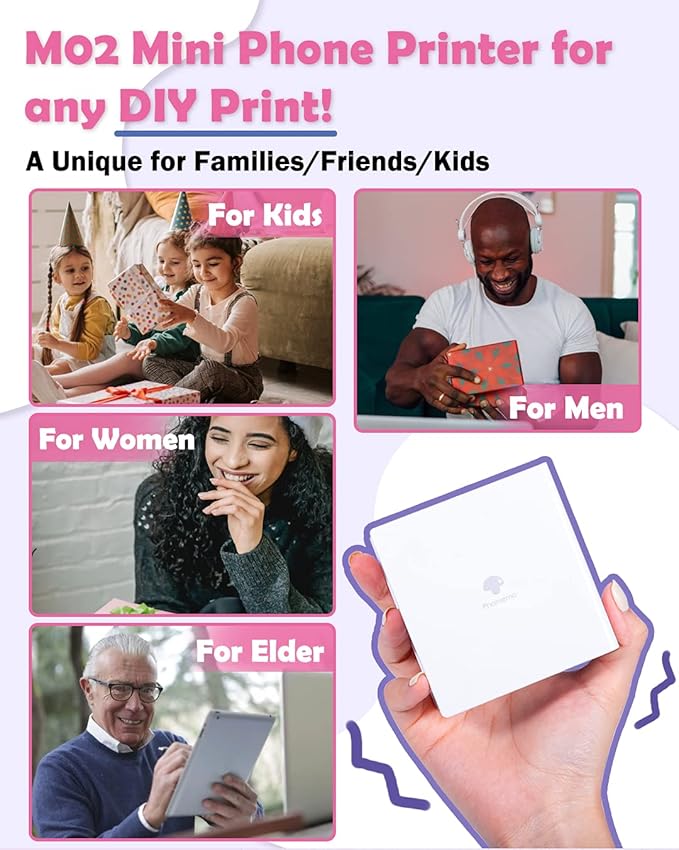 - Portable Size and Fashion Design- M02 pocket printer simple stylish shape, mini size (3.3 * 3.2 * 1.6 inch) slips neatly into your pocket. This sticker printer is ideal for Halloween, Thanksgiving day and holiday present to family and friends