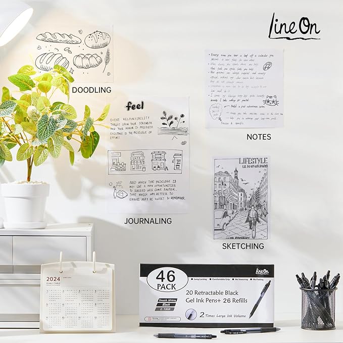 - UNLIMITED USES: Lineon 46 pack retractable black gel Ink pens are ideal for school, office and home use. These fine point gel ink pens are suitable for journal, note taking, journal,dairy writing and more.