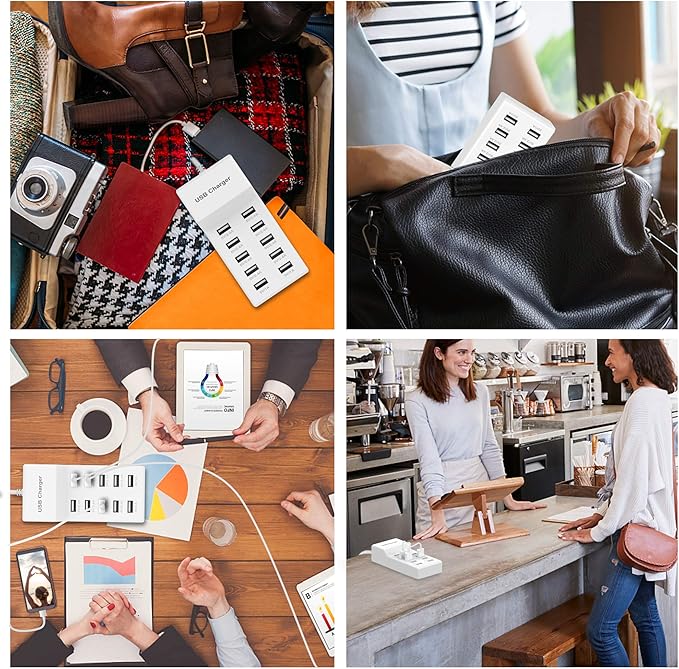 USB Charger Station Block with Rapid Charging Auto Detect Technology Safety Guaranteed 10-Port Family-Sized Smart USB Ports for Multiple Devices Smart Phone Tablet Headphones