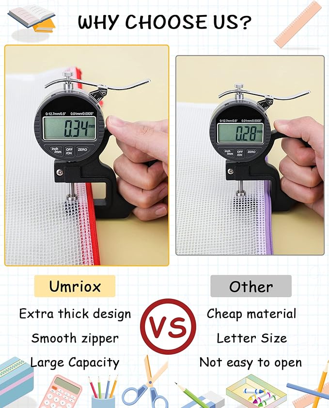 - Sturdy and Thickness Upgrade: Umriox zipper pouches are made of thickened PVC, waterproof and moisture resistant (except the zipper). The thickness is upgraded to 0.34mm, thicker than the average mesh zipper bags on the market