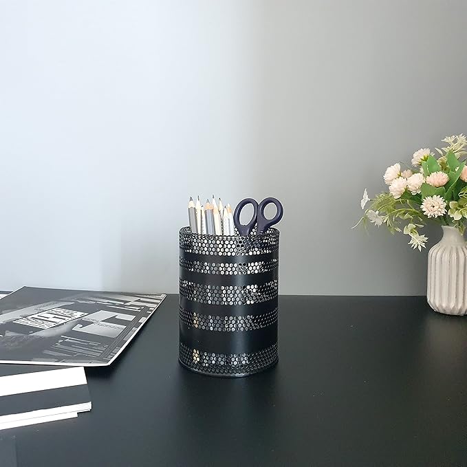Metal Mesh Pen Pencil Cup Holder Stand Office Desk Organizer Stationery Caddy Makeup Brush Holder, Black (Large)
