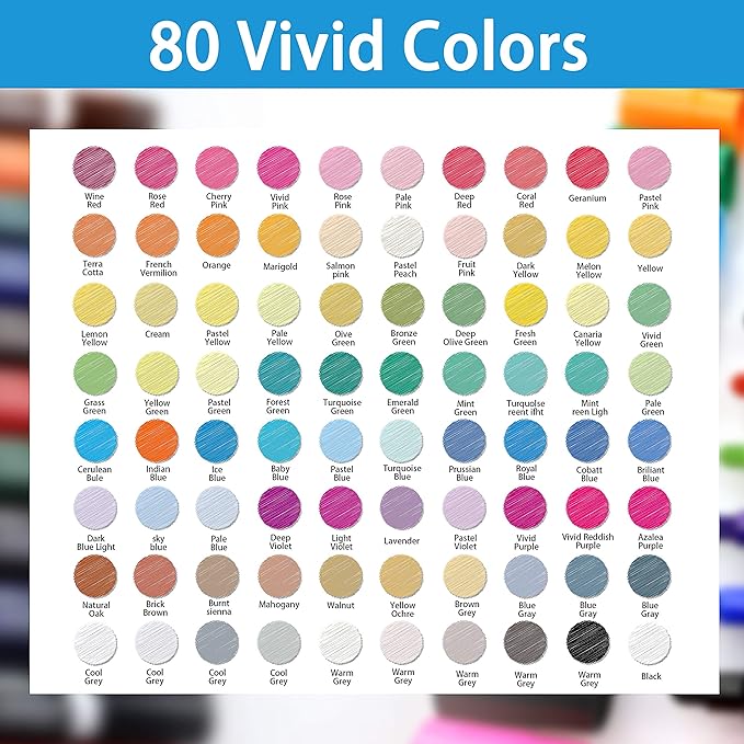 - 80 Vibrant Colors + 1 Free Colorless Blender: Brush tip markers for adult coloring books , anime pictures, fashion design, coloring, drawing, writing, sketching, illustrating, shading, designing, rendering, manga, comics, cartooning, etc. Great as Markers for Adult Coloring, art markers, sketching markers, drawing markers, permanent markers, alcohol based markers, alcohol markers brush tip, alcohol brush markers.