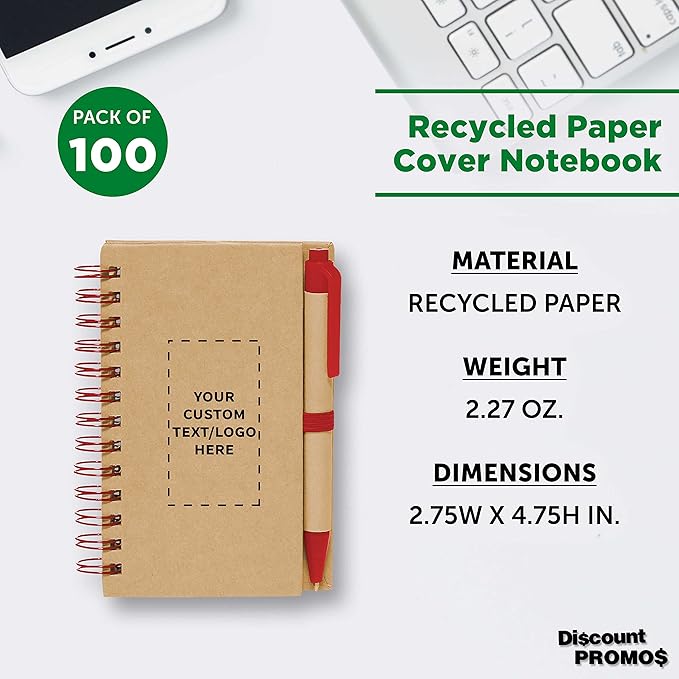 Custom Mini Spiral Notebooks with Black Ink Pens Set of 100, Personalized Bulk Pack - Perfect for School, Office, Business, Home - Red