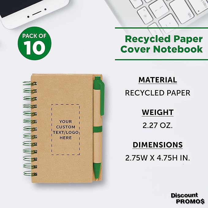 Custom Mini Spiral Notebooks with Black Ink Pens Set of 10, Personalized Bulk Pack - Perfect for School, Office, Business, Home - Green