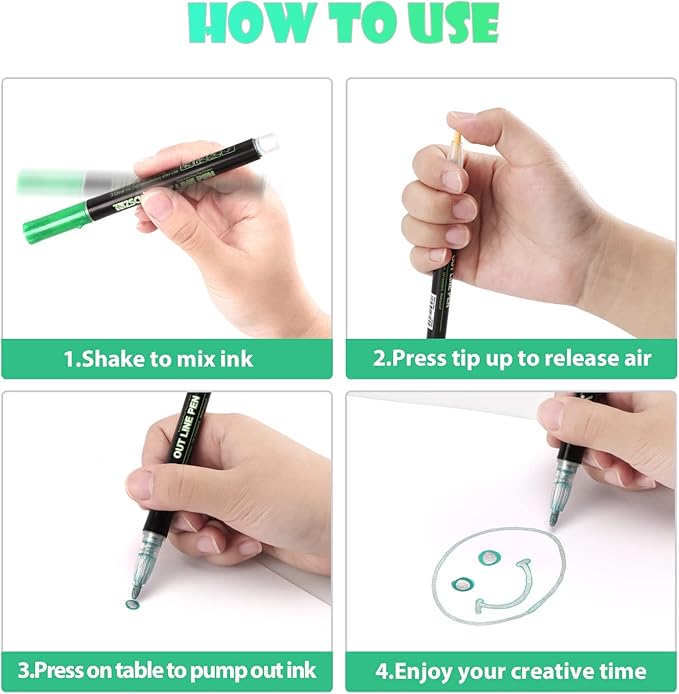 - Safety & Fast-Drying: Our outline markers self-outline metallic markers are all filled with non-toxic and eco-friendly ink with vivid and bright colors. No ink leaking and color fading concerns. Our ink lends itself to a smooth application that dries quickly.