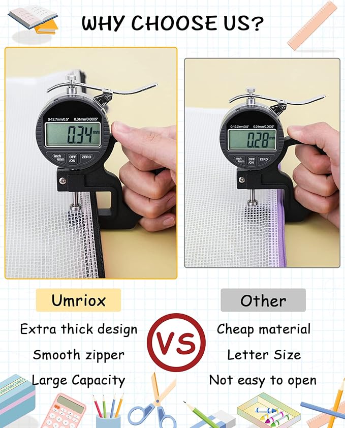 - Sturdy and Thickness Upgrade: Umriox zipper pouches are made of thickened PVC, waterproof and moisture resistant (except the zipper). The thickness is upgraded to 0.34mm, thicker than the average mesh zipper bags on the market