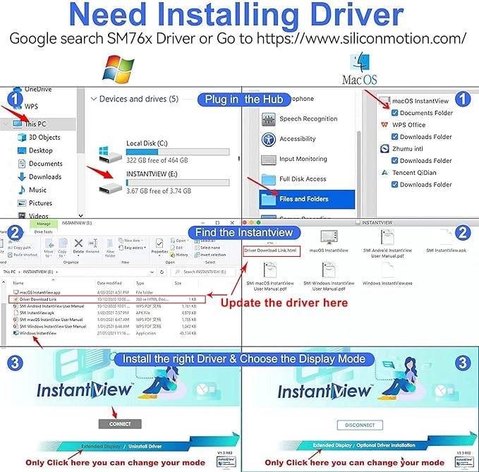 - THIS HUB REQUIRES TO INSTALL DRIVER: Please connect the usb 3 docking station and open the "INSTANTVIEW", Check the instructions on the USB flash drive. PLEASE CHECK THE USER MANUAL for your reference. An ideal HDMI dual monitor adapter for MacBook Air/Pro M1 M1 pro M2, iMac/iMac Pro, PS4 Pro, surface Pro, Chromebook Pixel, Dell, ASUS, HP, Lenovo, and more Thunderbolt 3/4 or USB 3.0 laptops