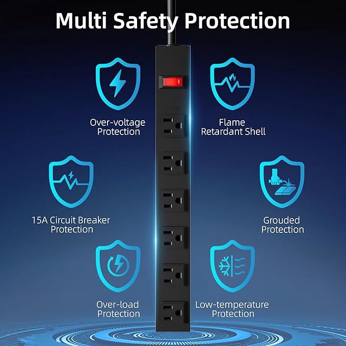 - OVERLOAD PROTECTION:A power switch with lighting has a built-in high quality 15A circuit breaker for overload protection. When the operating current exceeds the rated current, this power strip automatically cuts off the power supply from spikes, fires or other unsafe conditions.