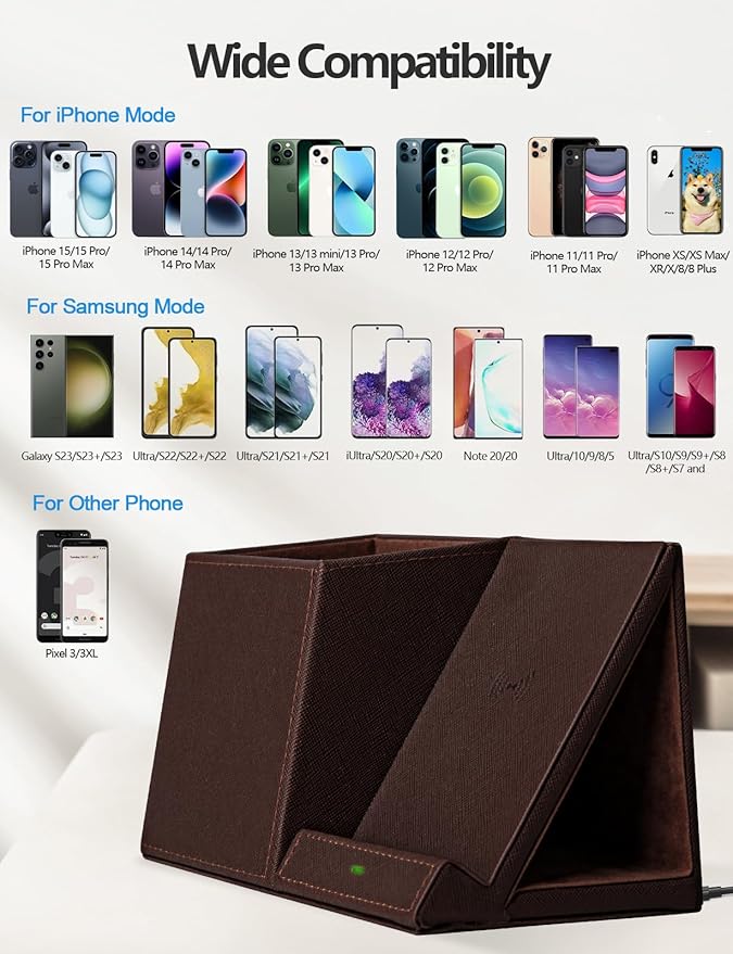 - ✎✎✎ Universal Compatibility of Wireless Charger: 7.5W fast charging for iPhone 16/15/14/14 Plus/14 Pro/14 Pro Max/13/13 Pro/13 Mini/13 Pro Max/12/SE 2020/11/XS/XR/X/8; 10W fast charging compatible for Samsung galaxy S24/S23 Ultra /S23/ S23+/S22 Ultra / S22 / S22+ / S21 Ultra /S21+ / S21/ S20 Ultra / S20/Note 10/S10/S10E and So on; (Note: Adapter is NOT Included)