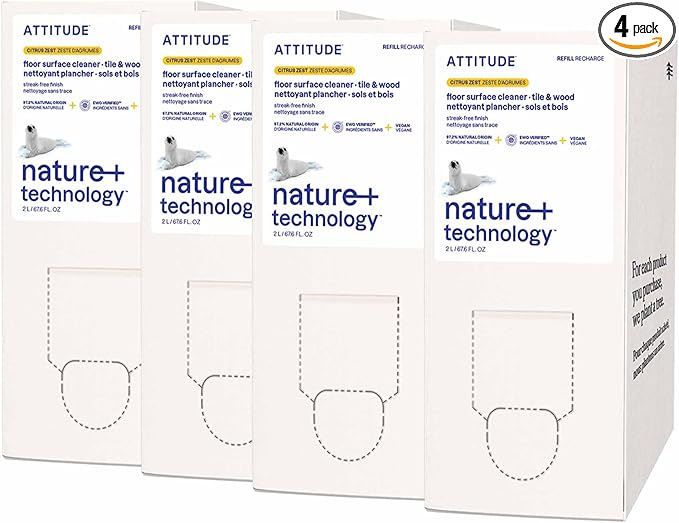 ATTITUDE Floor Cleaner Refill, EWG Verified, Streak-Free, Vegan & Plant-Based for Tile, Wood & Laminate Floors, Citrus Zest Scent, 67.6 Fl Oz (Pack of 4)