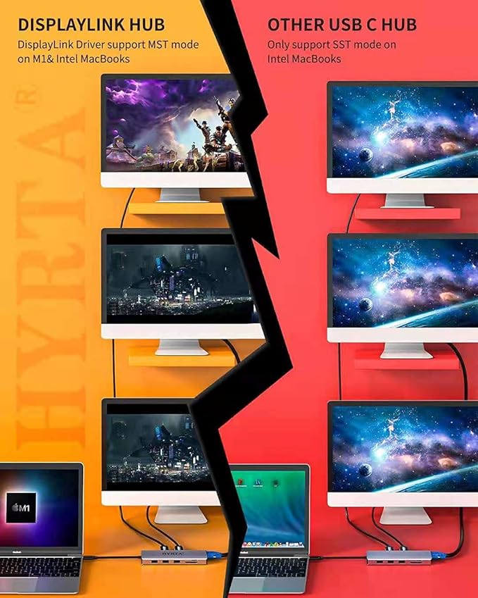 - Compatible for M1/M2/M3 MacBook :HYRTA laptop docking station has more powerful and stable with the ports of connectivity, supports triple Monitors for MacOS and Windows, and dual monitor non-mirror expended. You can expand your laptop's desktop to dual or triple displays at once to increase work and study productivity, make you start a more intelligent life.