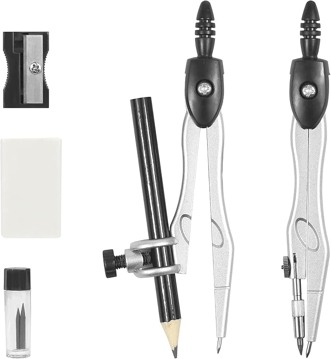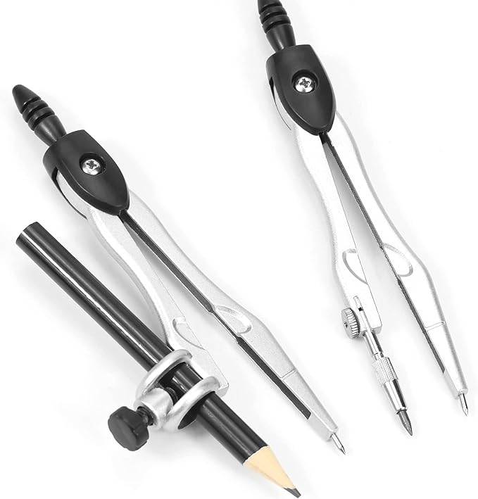 - A Practical Compass Geometry Set:Long-Lasting metal compasses will not bend, Ergonomically designed compass head is comfortable to hold, Universal Holder Compass work with any standard sized pencil or pen