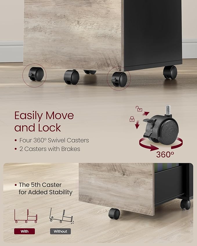 - 【LOCKABLE, SWIVEL CASTERS】Five 360° swivel casters allow you to move this filing cabinet around with ease. The 2 front casters are lockable to keep the cabinet in place when stationary and the fifth wheel on the bottom drawer adds to overall stability