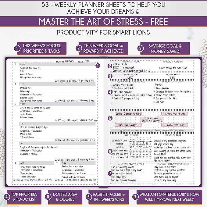 - UNDATED PLANNER - All the tools for success you need to create the life you've always wanted. This planner measures A5 (6 x 8.5 inches) and boasts thick 100 gsm paper. It features a Horizontal Planner layout, offering 212 pages for life transformation, including 53 weekly spreads, 12 monthly planning overviews with reflection sections, 22 dotted journal pages, habit trackers, mind maps, morning and evening routines, inner pockets, pen holder, and comes in a gift box. This life planner is undated, serving as a daily, weekly, and monthly planner, giving you the freedom to start your journey whenever it suits you best.