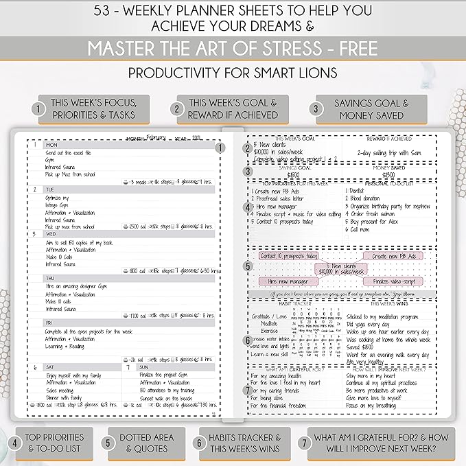 - UNDATED PLANNER - All the tools for success you need to create the life you've always wanted. This planner measures A5 (6 x 8.5 inches) and boasts thick 100 gsm paper. It features a Horizontal Planner layout, offering 212 pages for life transformation, including 53 weekly spreads, 12 monthly planning overviews with reflection sections, 22 dotted journal pages, habit trackers, mind maps, morning and evening routines, inner pockets, pen holder, and comes in a gift box. This life planner is undated, serving as a daily, weekly, and monthly planner, giving you the freedom to start your journey whenever it suits you best.