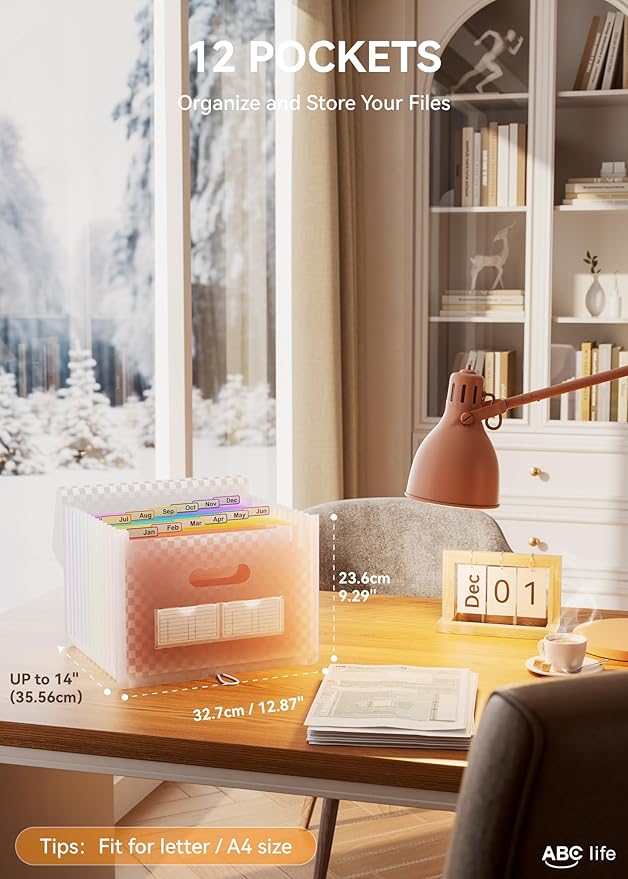- ✅【12 POCKETS MONTHLY FILE ORGANIZER】ABC life 12 pockets Accordian File Organizer suitable for filing tax and storing important family documents. Product size is 13 "x 9.4"x 14", which can be used to store plenty of Letter/A4 size files.