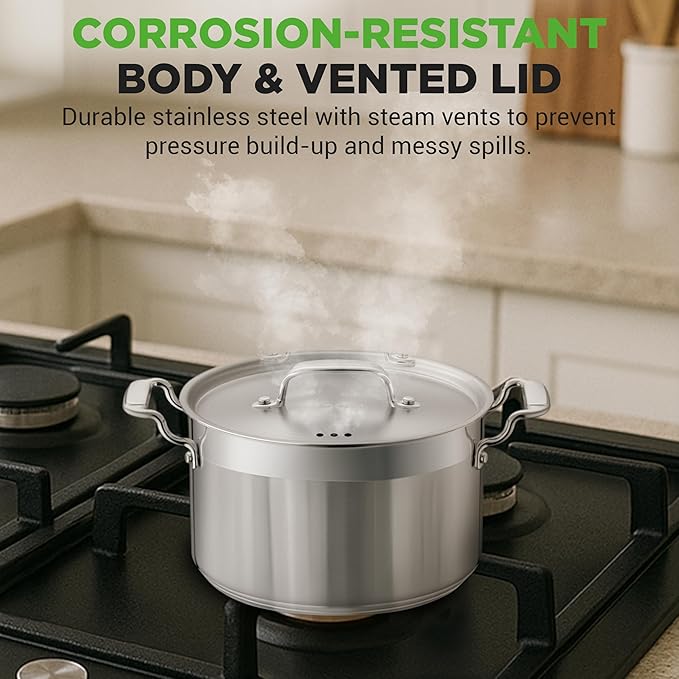 - FOOD-GRADE STAINLESS STEEL:Made of 18/8 non-reactive stainless steel interior which is non-toxic, non-allergic & safe for cooking. Has an impact-bonded base for even heat distribution w/ base thickness of 0.118” & pot dimension of 11.85”x9.33”x6.30”