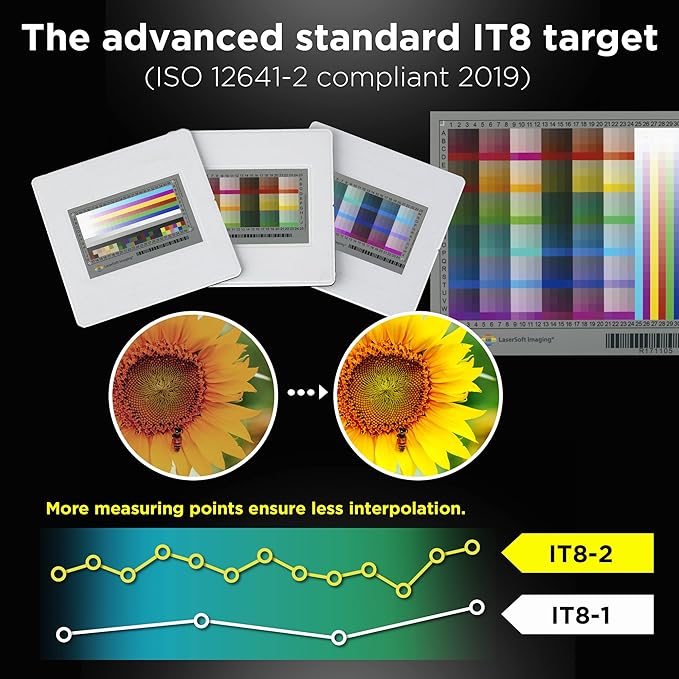 - [Advanced IT 8 Targets Included] bundled with 3-slide of 35mm Calibration Target (99 USD), this advanced standard IT8 target (ISO 12641-2 compliant 2019) gives more measuring point to ensure less interpolation while performing scanner color calibration.