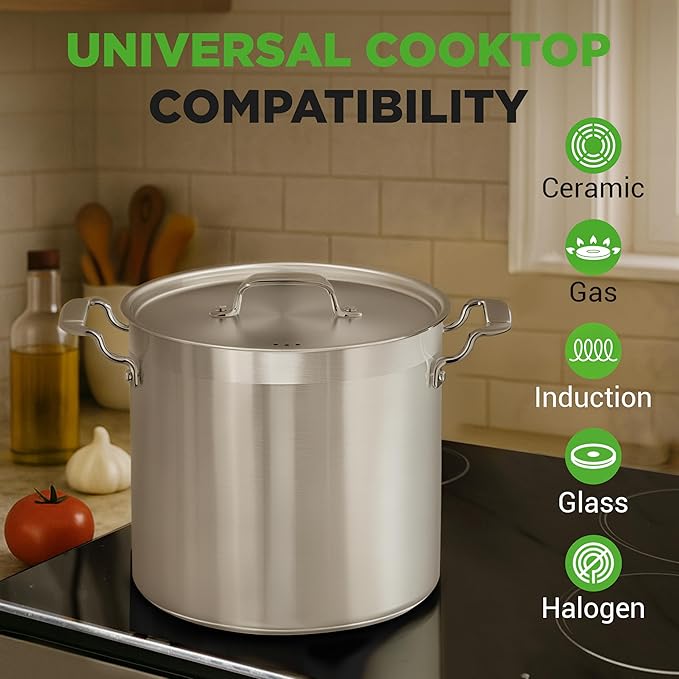 - COOKTOP COMPATIBILITY: This stainless steel cookware stockpot is compatible with gas, induction, and ceramic, perfect for even the most seasoned cooks. You can also use this as your soup pot, boiling pot
