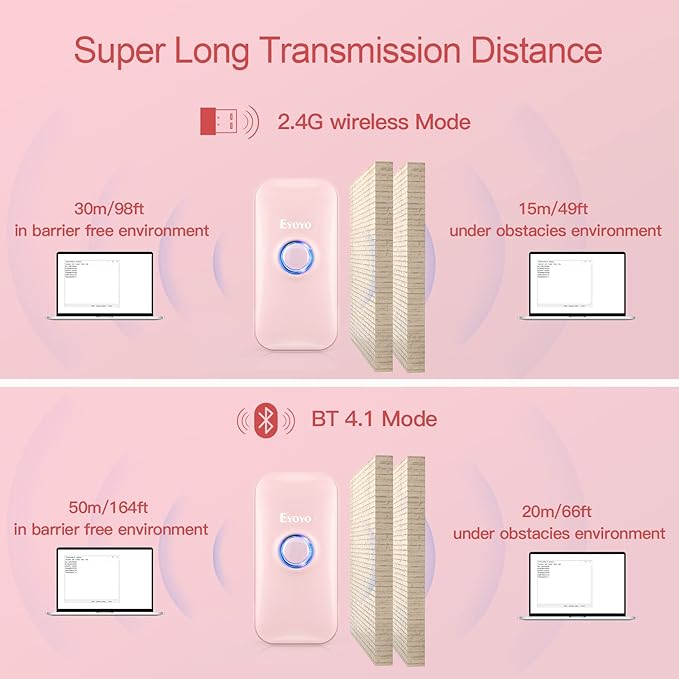 - 3-in-1 Connection Ways: You can according to your needs switch between 2.4G wireless & Bluetooth & USB wired three types of connection modes more convenient. Also, the Eyoyo Bluetooth barcode scanner delivers up to 30m/98ft transmission distance barrier-free under the 2.4G wireless mode, and up to 50m/164ft transmission distance barrier-free under the Bluetooth mode