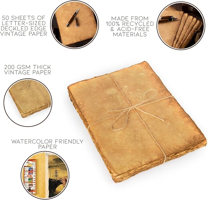 - 200 GSM LETTER SIZED PAPER - These papers are made from 100% recycled and acid-free materials, 200 GSM. Each pack contains 50 sheets and each sheet is 11" long 8.5" wide. Ancient Looking Paper which looks like it was pulled out from history, will last for generations.