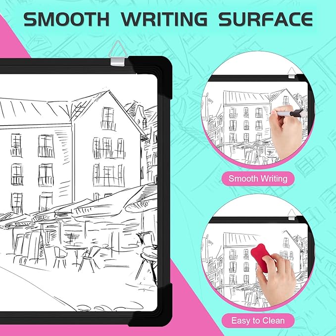 - Durable & Portable White Board: Dry erase calendar board for wall with aluminum frame is solidly built, not easy to scratch or break. Featured with stain resistant surface, you can erase for countless times without any smudgy ghosting or staining. The movable hanging hooks can be adjust the hanging distance, allows you to set up your dry erase board calendar either horizontally or vertically. Small portable whiteboard is lightweight, it is suitable for handheld as well.