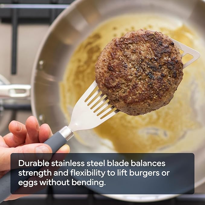 - PRECISION IN EVERY FLIP: This wide-slotted turner is perfect for cooking a variety of meals. Whether it's delicate eggs, sizzling fish, meaty burgers, or fluffy pancakes it allows you to fry and flip with ease, ensuring your creations are cooked just the way you desire.