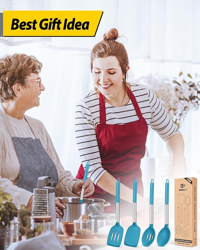 Pack of 4 Silicone Cooking Utensils Set, Non Stick Large Solid Spatulas, Heat Resistant Blue Slotted Spoons, Ideal BPA Free Kitchen Turners for Frying, Mixing,Serving,Draining,Turning,Stirring