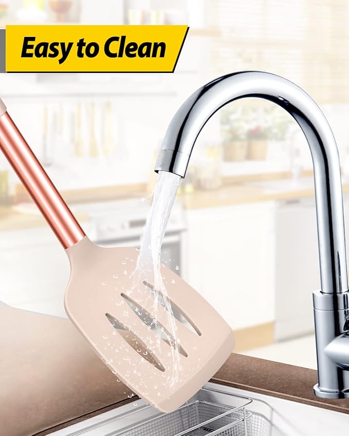 Pack of 4 Silicone Cooking Utensils Set, Non Stick Large Solid Spatulas, Heat Resistant Rose Gold Khaki Slotted Spoons, Ideal BPA Free Kitchen Turners for Frying, Mixing,Serving,Draining,Turning