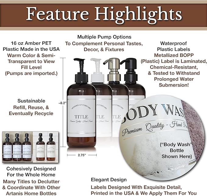Amber PET Plastic Refillable Hand Sanitizer Pump Bottle Dispenser 304 Grade Stainless Steel Pump, 16 oz, Waterproof Label, Empty Reusable Container for Kitchen, Bathroom, Business