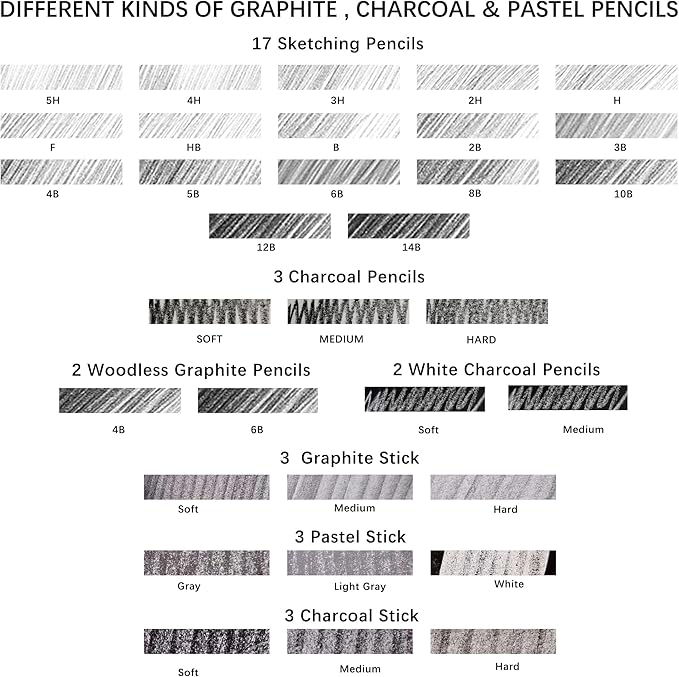 - 【Pro Drawing Pencils】: Variety of pencils for all your artwork needs. Including 17 shading pencils(5H-14B),3 charcoal pencils,2 white charcoal pencils,2woodless graphite pencils.Non-toxic and eco-friendly, pencils conform to ASTM D-4236 and EN71 standards.You can use a variety of tones in your drawing to create depth and dimension.