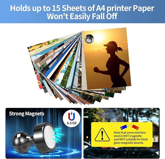 - 【Strong Fridge Magnets】Do not be fooled by these magnets for fridge, They can hold up to 15 sheets of A4 printer paper at once with just a tiny magnet. Even possible to use them in the kitchen to hold cooking tools that weigh no more than 6.5 OZ and the cooking tools won't easily fall off.