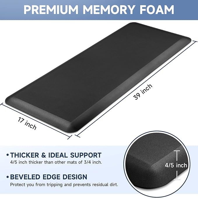 - 【Thicker Mat】The StepRite kitchen mat is made of 4/5 inch thick memory foam for better support and comfort when standing. Measured as 17*39 inches. Suitable for kitchen, office, laundry room or any high-traffic area.