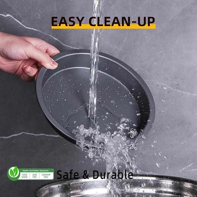- PREMIUM EXTRA-THICK MATERIAL - With 27% thicker carbon steel, this durable 8inch cake baking pans set is constructed from heavy-gauge carbon steel for stability, even heat distribution, and durability for years to come. Warranty against peeling off with heat-resistance temperature: 450℉