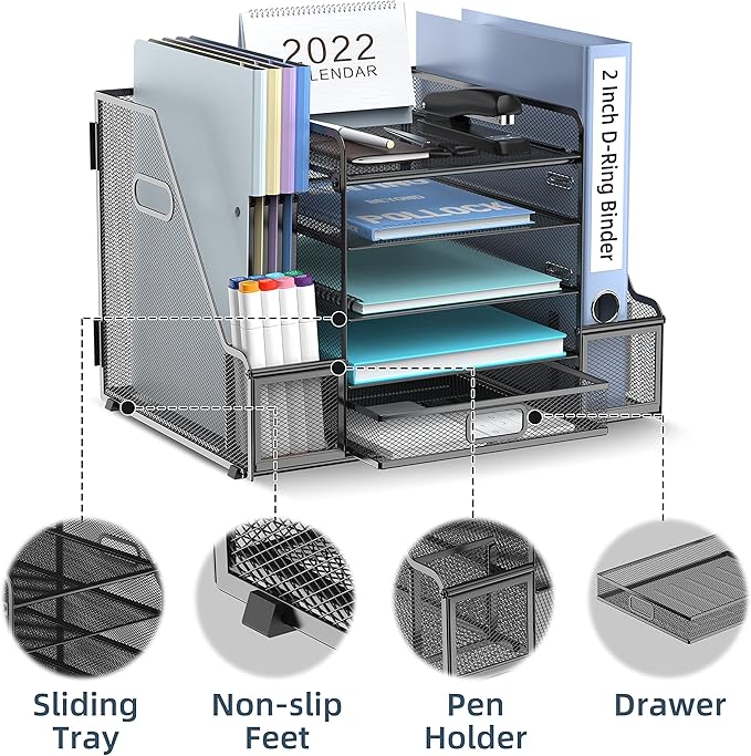 SUPEASY Mesh Desk Organizer with File Holder, 5-Tier Paper Letter Tray Organizer with Magazine Holder, Desktop Organizer and Storage with Drawer for Office Supplies Home or School, Black