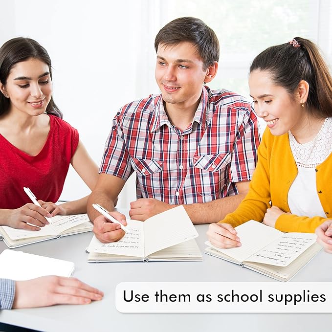 - Feela 24 Pack Classic Ruled Notebooks contains 24 white ruled sturdy cover notebooks and 24 Black Retractable Pens. Each of the notebooks measures 8.3” x 5.1”, which is perfect to carry and easily held by young girls and boys. These black cute pens are customized to be placed in the pen holder, which is pretty convenient.