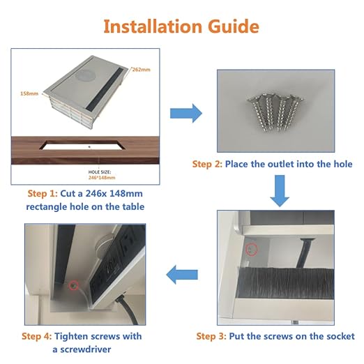 - 【Easy to Install】Cut a rectangle hole on table, place the outlet into the hole, then screw it tight. Panel size: 10.31" x 6.22"(262 x 158 mm), suggested hole cut size: 9.69" x 5.83" (246x 148mm)