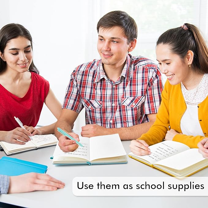 - 3 different solid colors for these notebooks, Yellow, Orange and Emerald. There are 3 Black Retractable Pens in the box. You can use it as soon as you receive it. These pens are perfect to be put in the pen holder of the classic ruled notebook. Large tube has the capacity of restoring more ink, which makes them long lasting. Quick drying can avoid smearing and smudge.
