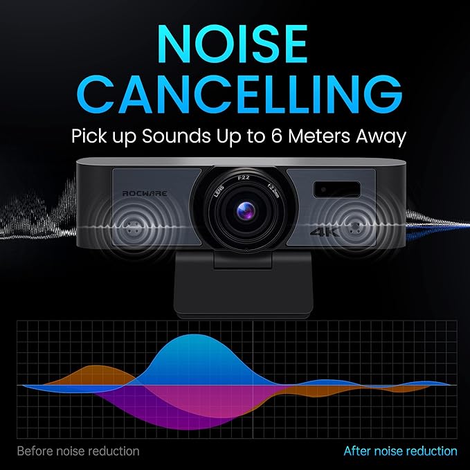 - 【Built-in Stereo Microphone & Echo Cancellation Noise Reduction Technology】The 4K computer webcam is equipped with built-in omnidirectional noise reduction microphone, which can make your voice clear and filtering out background noise. This Rocware USB camera can bring your audience an excellent audio effect, making it suitable for many fields such as online teaching, video calling, web conferencing, portrait capture, etc