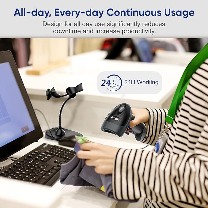 - Plug and Play USB Barcode Scanner, All Days Working: This wired USB barcode scanner delivers plug-and-play simplicity, no need drive and software, easy to use. The EY-H2 is designed for continuous usage all day as it is always ready for the next scan, with no need to charge, which significantly reduces downtime and shortens check-out lines. The Eyoyo scanner will provide lasting impressions for your loyal customers driven by fast, accurate, and friendly checkout experiences