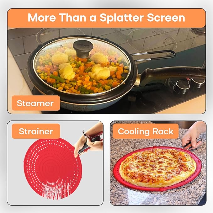 - MULTI-FUNCTION KITCHEN TOOL – Use this silicone splatter screen as a frying pan cover, food strainer, baking mat, or cooling rack. Designed for pans, pots, and skillets; ideal for everyday cooking.