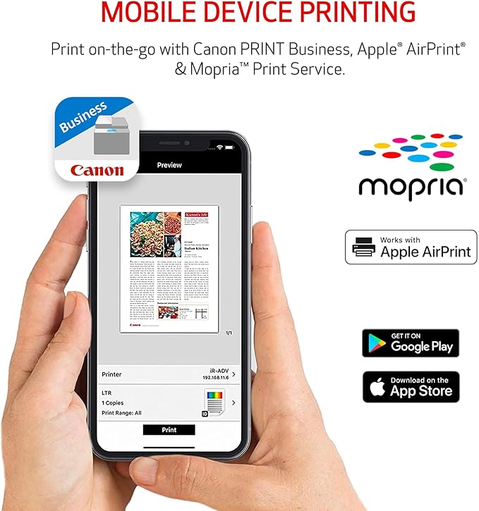 - Print on-the-go with Canon PRINT Business, Apple AirPrint and Mopria Print Service