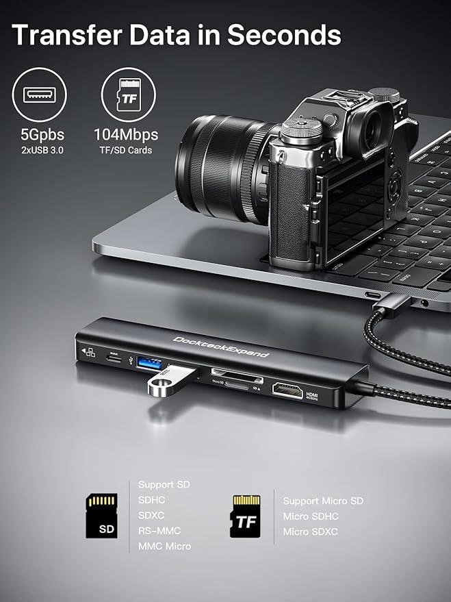 USB C Hub Multiport Adapter, DockteckExpand USB C Dongle 7 in 1 with 4K 60Hz HDMI Port, 1Gbps Ethernet, 100W PD, 2 USB 3.0 Ports, SD/TF Card Reader for MacBook iPad HP Dell XPS and More