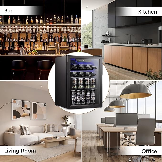 - ESSECTIVE BEVERAGE COOLER:This cooler runs on a powerful but quiet compressor. Built-in LED light allows you to clearly find drinks even at night. It also has adjustable shelving for a variety of beverages